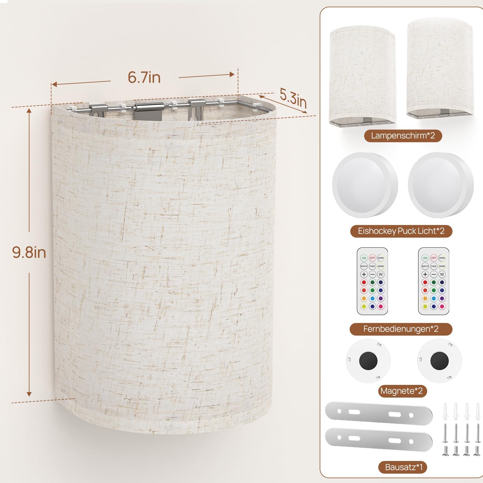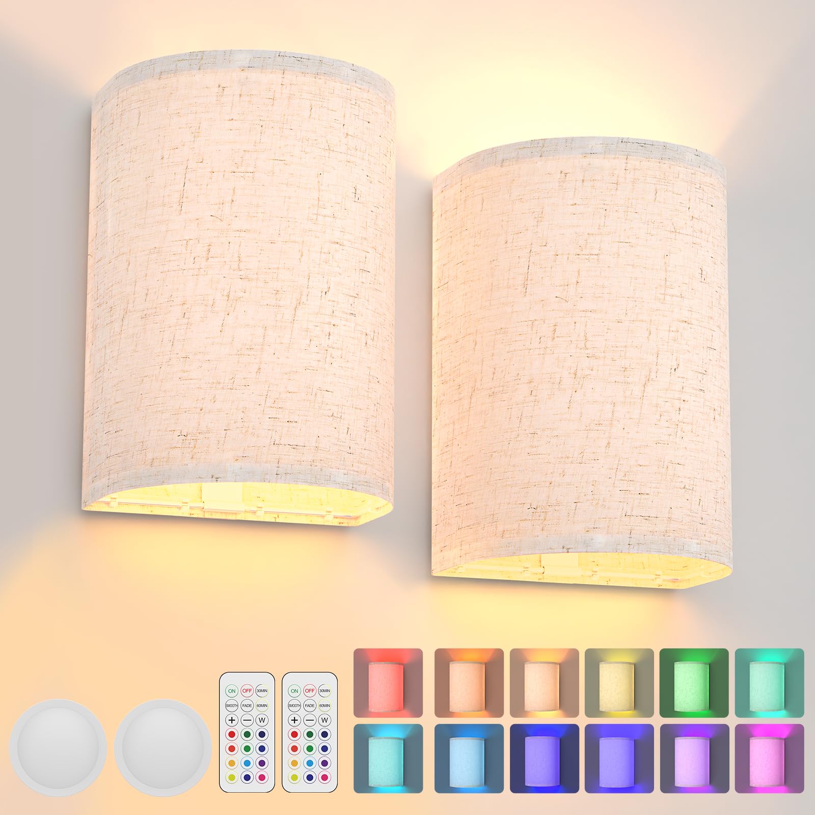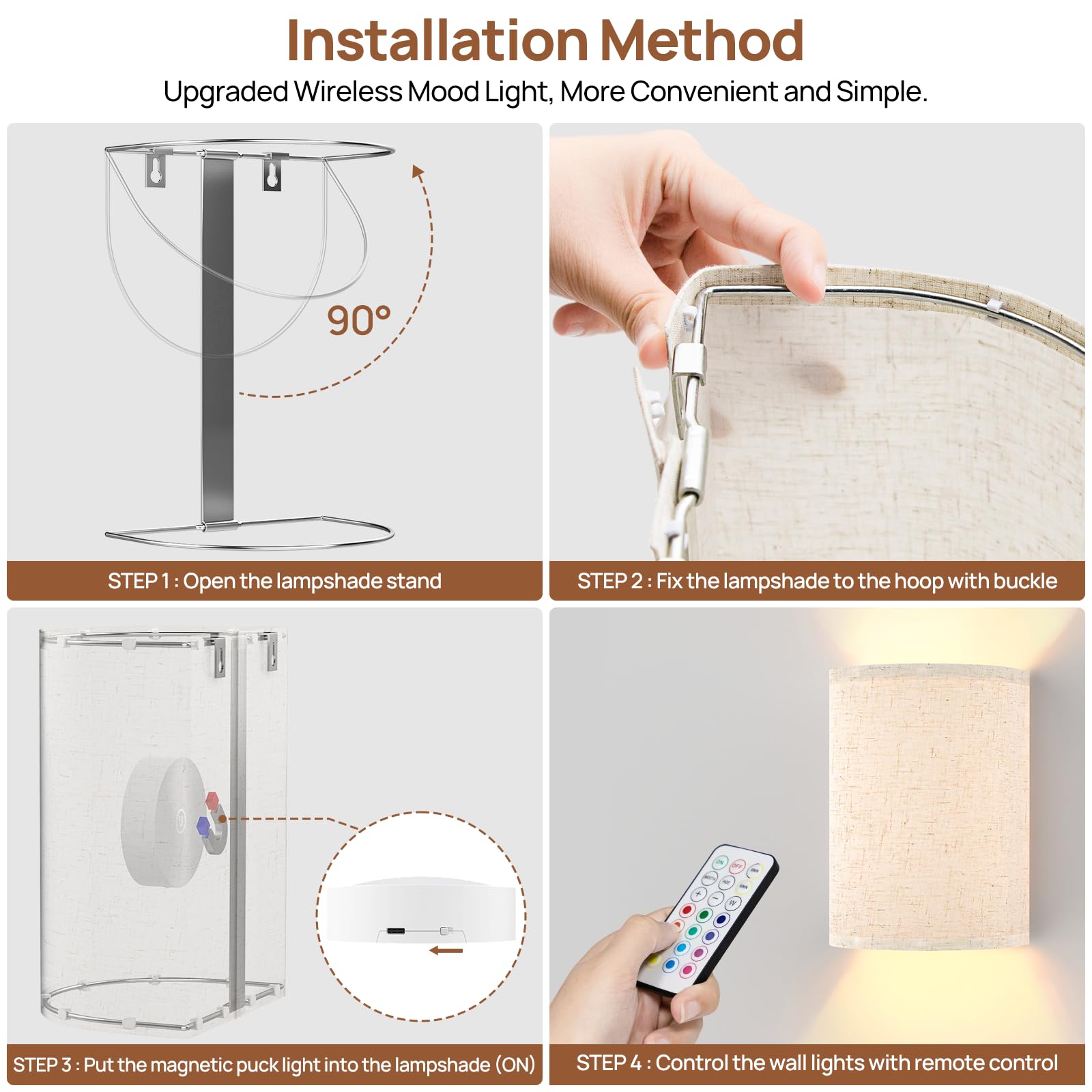 Easy to Install & Rechargeable Battery–HURYEE wireless wall lights indoor are made of high-quality metal and fabric, which are durable. With the included screws and anchors,battery wall lights can be easily installed on the wall in just a few minutes.HURYEE battery operated wall light has a powerful 15W LED, while E27 puck light only offers 3W at most. The high brightness provides enhanced visibility.