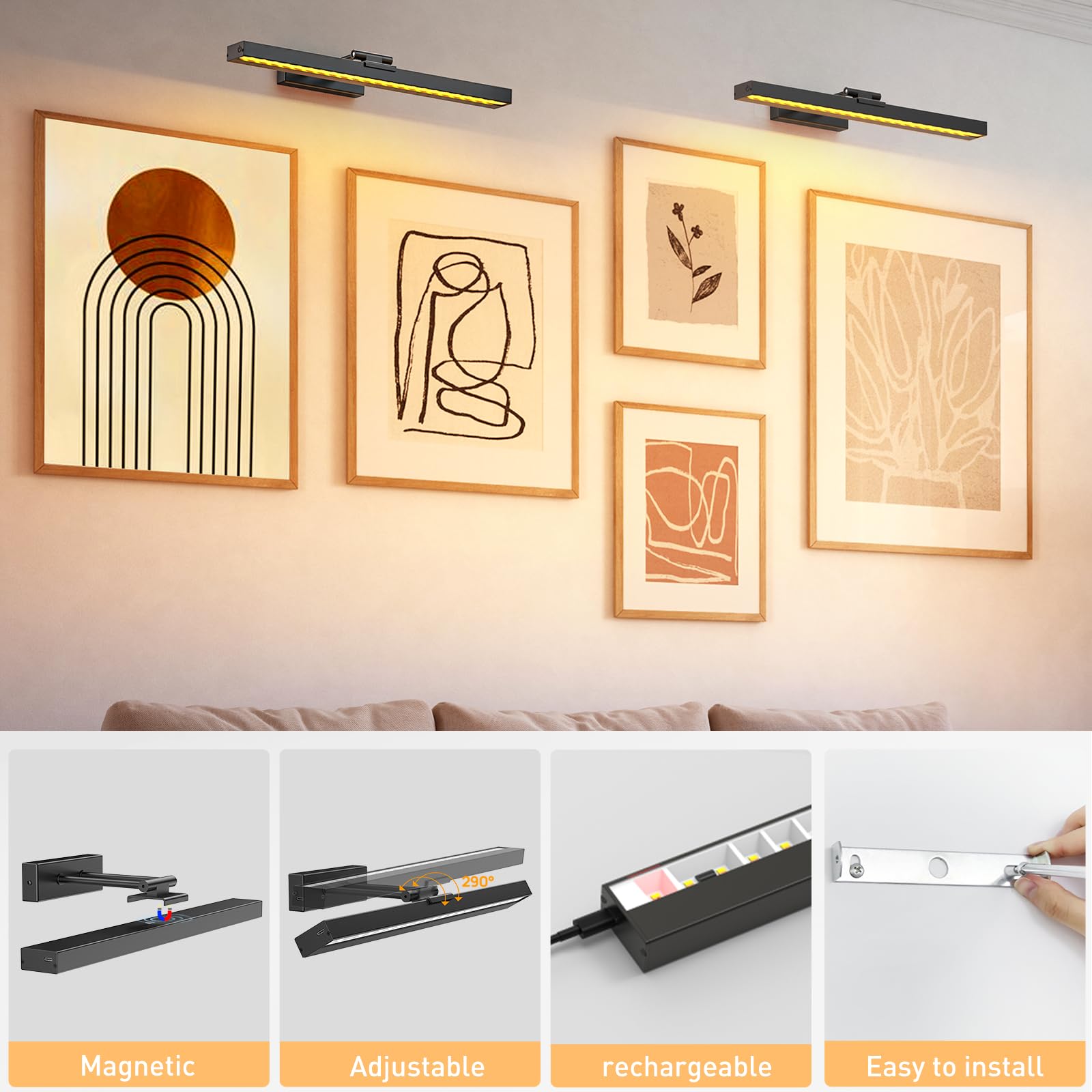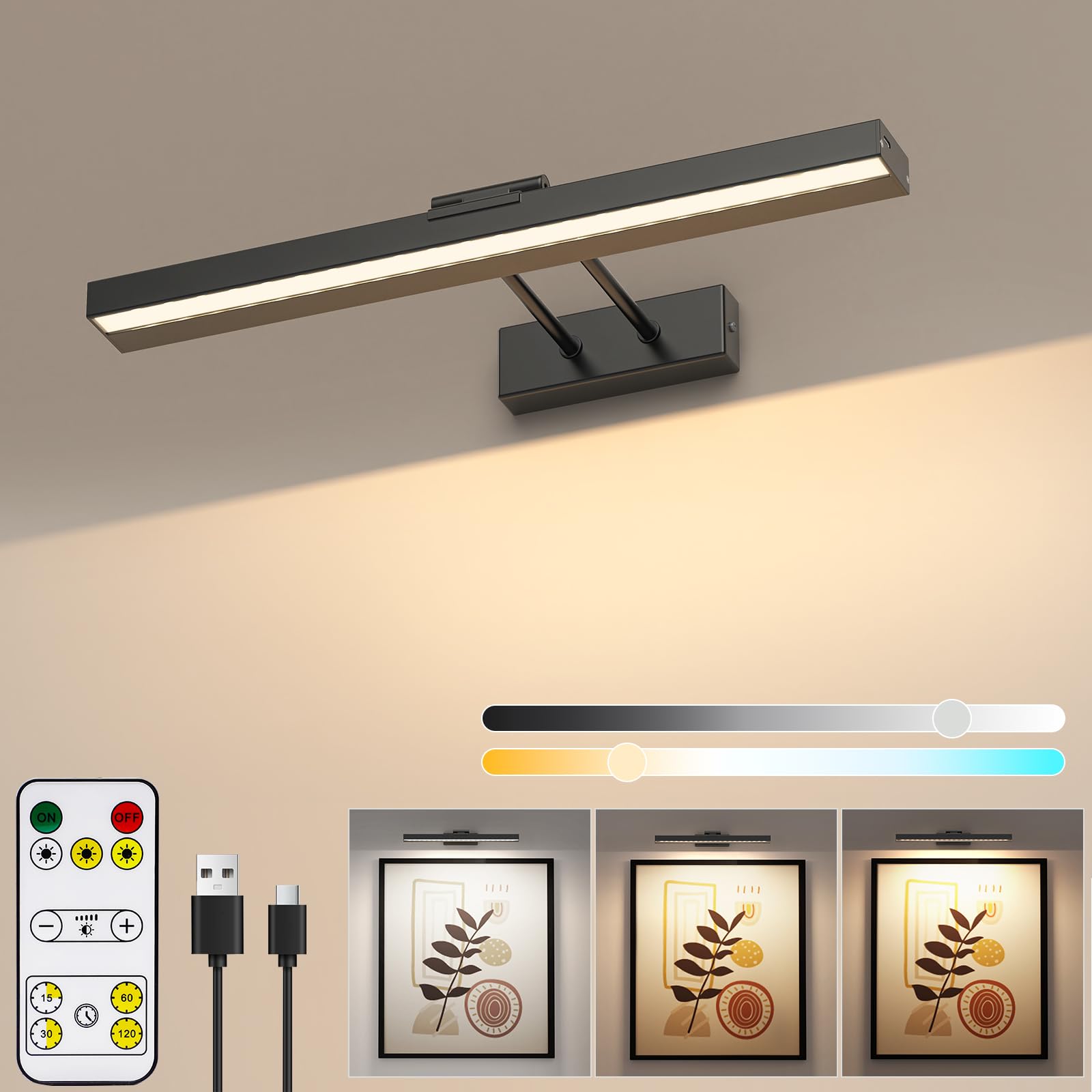 - [Rechargeable Picture Light]: Our rechargeable picture light charges fully in less than 3 hours and lasts up to 15 hours on the lowest setting. Benefit from wireless picture lights for wall with easy recharging.The painting light features a 4000mAh large-capacity rechargeable battery, ensuring fast charging and long-lasting performance, lasting for over 30 hours in 25% mode without requiring battery replacement.Detachable for effortless recharging.