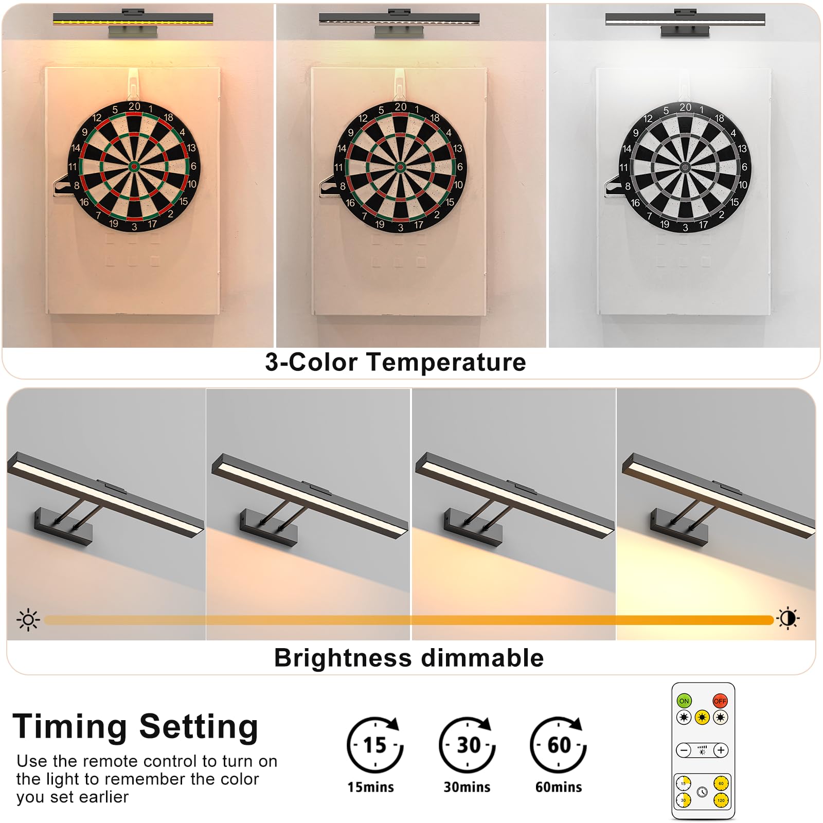 - [3 Color Temperatures and Dimmable]: The wireless picture light offers 3 color temperatures (3000K,4000K,6500K) and is dimmable. Adjust brightness in 5 levels using the remote control for flexible settings. Wall art light comes with a unique magnetic mount, enabling you to adjust the lighting angle as needed for the best lighting effect.
